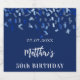 A label for a 50th (or any age) birthday party. A navy blue background with blue confetti. Personalise and add a date, name and age 50. The name is written with an elegant hand lettered style script.