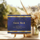 A 50th (or any age) Birthday Party Guest Book for him, boy, guy in dark blue, navy blue background. The blue colour is uneven. With a faux gold frame and golden confetti sprinkle, golden coloured letters.