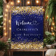 A welcome poster for a girly and glamourous 21st (or any age) birthday party. A navy blue uneven coloured background decorated with faux gold confetti. Personalise and add a name and age 21. Welcome with a heart.
