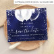A girly and trendy Save the Date for a 21st (or any age) birthday party. A navy blue uneven coloured background. Decorated with faux silver glitter and white balloons. The text: Save the Date is written with a large trendy hand lettered style script.