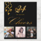 A bottle label for a glamourous 21st (or any age) birthday party. Personalise and add 3 of your own photos, a name, age 21 and a date. Date of birth or the date of the party. Golden coloured letters. The word: Cheers, in faux gold written with a trendy hand lettered style script. Elegant, classic chic black background colour, decorated with faux gold party streamers.