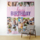 Birthday Backdrop with personalised photo collage and name. Substantial piece of birthday party decor, great talking point and perfect backdrop for photobooth or entrance welcome. Happy Birthday is lettered in modern casual script and bold typography. The template is ready for you to add your pictures in rows, working left to right and will display your photos in a combo of square, portrait and landscape formats. It has a colour palette of pink and purple but, if you want to change the colours, click "customise further" or message me for assistance.
