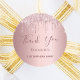 A sticker for a girly and glamourous 21st (or any age) birthday party. A dusty rose, pink metallic looking background with faux glitter drips, paint dripping look. The text: Thank You is written in dark rose gold with a large modern hand lettered style script.