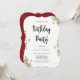 Chic and modern birthday party invitation with stylish typography on the front and elegant red with faux gold marble on the back of the card.