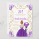 This birthday party invitation features an elegant gold frame, a beautiful princess with red hair and a purple dress, flowers and a balloon. This is perfect for a birthday party.