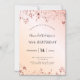 On front: An invitation for a 50 years old, 50th (or any age) birthday party. A rose gold, blush pink coloured gradient background. Decorated with rose gold and pink stars dripping. Personalise and add a name and party details. The name is written with a hand lettered style script, black coloured letters.