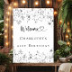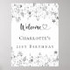 A welcome poster for a girly and glamourous 21st (or any age) birthday party. A white background decorated with faux silver dripping stars. Personalise and add a name and age 21. Welcome with a heart.