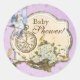 This Baby girl baby shower sticker features an elegant hand painted parchment, aged background and a beautiful detailed vintage fairy, pocket watch, birds and flowering tree branch tag layered over an intricate scalloped border. All of this artwork is either from 19th century vintage paintings (carefully graphically designed) or made from original artwork by Audrey Jeanne Roberts. The result is a beautifully elegant and ethereal Newborn Baby or Little girl birthday ensemble for your "Fairy Princess!" YOU MIGHT ALSO ENJOY:SHOWER INVITATION: