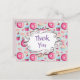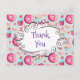 A personalised thank you postcard for your birthday party guests. Personalise with your name on the back. The front has a pattern of glazed pink doughnuts with sprinkles. Mouth watering cupcakes in pink and blue with rosettes and strawberries on top. Some pastel pink french pastry macarons and some little pink candy buttons. A fancy whimsical frame in the centre says "Thank You" in a cute font. The back has a birthday message all prepared, all you have to do is add your name.
