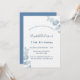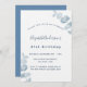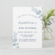 A white background, decorated with dusy blue eucalyptus stems, sprigs. Personalise and add a name and party details.