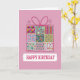 This is a birthday card with a birthday present created with a nine patchwork block appliqué using a zig zag stitch. The background is polka dots and the text says, ‘Happy Birthday.’
