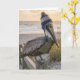 A pelican perched on a beach fence wears a winter hat and vest, set against a serene backdrop of gentle ocean waves and a soft sky