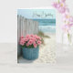A basket of pink petunia flowers rests beside a wooden fence, leading to a scenic view of the beach and ocean waves for birthday.