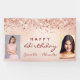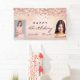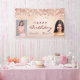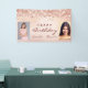 A banner for a girly and glamourous birthday party for two girls, women. Sisters, twins, friends or family members. A rose gold and blush pink gradient background, glitter dust. Add your own 2 two photos of the birthday girls. Text: Happy Birthday. The word Birthday and the names are written with a modern hand lettered style script. Can be used as a welcome banner and as party wall decoration.