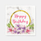 Happy Birthday paper napkins with an elegant design - a faux marble texture in white makes up the background. Layered over top is a frame with a faux gold foil border. Large pink and purple watercolor magnolia flowers with green leafy accents decorate the design.