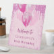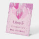 A welcome sign for a girly and glamourous 18th (or any age) birthday party. A trendy pastel pink background with elegant faux sparkles and pink balloons. Personalise and add a name and age 18. Dark pink letters.