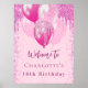 A welcome poster for a girly and glamourous 18th (or any age) birthday party. A trendy pastel pink background with elegant faux sparkles and pink balloons. Personalise and add a name and age 18. Dark pink letters.