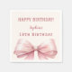 A cream, beige background colour. Decorated with a large pink bow. Personalise and add the name and date. Text: Happy Birthday!