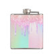 For a glamourous 21st (or any age) birthday party- A rainbow, unicorn coloured holographic background. Decorated with pink and purple faux glitter drips, paint dripping look. Personalise and add your name, purple letters The name is written with a modern hand lettered style script.