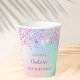 For a girly 10th (or any age) birthday party. A holographic, rainbow coloured background in pink, purple, rose gold and mint green decorated with purple and pink faux glitter dust. Personalise and add a date name and age 21. Purple letters.