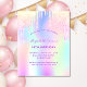 A girly and feminine 18th (or any age) birthday party invitation. On front: A holographic colored background in purple, pink, mint green, rose gold. Decorated with faux glitter drips in purple, pink and faux gold. Personalize and add a name and party details. The name is written with a hand lettered style script, purple colored letters.