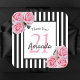 A sticker for a 21st birthday party. Classic slim black and white vertical stripes as background. With girly and feminine pink roses as decoration. With the curved text: Thank You!