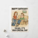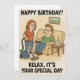 A hilarious birthday card design featuring a relaxed man enjoying his special day on the couch with cake and remote in hand—while his annoyed partner vacuums around him. The text reads, "Happy Birthday! Relax, it’s your special day." Perfect for anyone who loves a good laugh on their birthday and appreciates a bit of tongue-in-cheek humour.