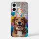 Funny and adorable phone case featuring a cute dog wearing a birthday hat with confetti and balloons. Perfect for celebrating birthdays with humour and charm.