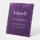 A welcome sign for a girly and glamourous 40th (or any age) birthday party. A deep purple background decorated with faux glitter, sparkles. The purple colour is uneven. Personalise and a name.