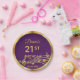 Modern and elegant purple background with faux gold music notes for a 21st birthday party. Templates for the age 21 and name. The name is written in a hand-lettered style script. Golden letters and number.
