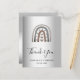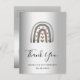 A thank you card for a 21st (or any age) birthday. A faux silver metallic looking background. Decorated with a modern abstract, minimalist painted rainbow with hearts. On front large black coloured hand lettered script and the text: Thank You, your text, title and a date.