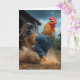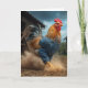 A strutting rooster is strutting confidently while wearing denim blue jeans in a dusty farmyard.