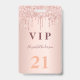 A modern, stylish and glamourous badge for a 21st (or any age) birthday party. A rose gold background with drip, paint drip look. The name is written with a modern dark rose gold coloured hand lettered style script. With the text: VIP Number 21 is written in a golden colour.