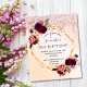On front: An invitation for a 50 years old, 50th (or any age) birthday party. A rose gold, blush pink coloured ombre background with a faux gold geometric frame. Decorated with dark purple and burgundy flowers, roses and boho style feathers. Faux rose gold glitter drips. Templates for a name and party details. The name is written with a hand lettered style script, grey coloured letters.