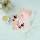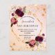 On front: An invitation for a 50 years old, 50th (or any age) birthday party. A rose gold, blush pink coloured ombre background with a faux gold geometric frame. Decorated with dark purple and burgundy flowers, roses and boho style feathers. Faux gold stars dripping. Personalise and add a name and party details. The name is written with a hand lettered style script, black coloured letters.