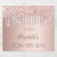 For a girly and glamourous 50th (or any age) birthday party with the girls. A faux rose gold metallic looking background with an elegant faux rose gold, pink and silver glitter drips, paint dripping look. The text: The name is written in dark grey with a large modern hand lettered style script. Personalise and add a name, age 50 and a date. Date of birth or the date of the party.