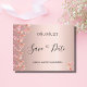An elegant and simple Save the Date card for a Quinceañera, 15th (or any age)birthday party. A chic rose gold faux metallic, foil looking background decorated pink and rose gold watercolored botanical florals. Templates for a date and name/age. Black coloured letters. The text: Save the Date is written with a large trendy hand lettered style script.
