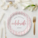 “Happy birthday”. Here’s an unique addition to your birthday fête! “Celebrate” with this stunning, modern, sparkly rose gold glitter dots and typography script against a dusty pink and white striped background, paper plate for an event to remember. Personalise the custom text with your guest of honour’s name. Your choice of 2 sizes: 7” or 9”. Guaranteed to add stylish fun to her special party! Matching and coordinating invitations, napkins and other birthday goodies are also available in this trendy and special collection.