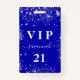 A modern, stylish and glamourous badge for a 21st (or any age) birthday party. A royal blue background with faux silver glitter dust. Personalise and add a name. The name is written with a modern hand lettered style script with swashes. The text: VIP Number 21. To keep the swashes only delete the sample name, leave the spaces or emoji's in front and after the name.