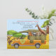 A safari-theme, drive by birthday invitation featuring a giraffe, elephant, zebra and lion in a land cruiser. (<a href='https://www.freepik.com/free-photos-vectors/flyer'>Flyer vector created by macrovector - www.freepik.com</a>). (<a href='https://www.freepik.com/free-photos-vectors/travel'>Travel vector created by macrovector - www.freepik.com</a>). (<a href='https://www.freepik.com/free-photos-vectors/tree'>Tree vector created by brgfx - www.freepik.com</a>). (<a href='https://www.freepik.com/free-photos-vectors/car'>Car vector created by gstudioimagen - www.freepik.com</a>). <br/><br/>The card is easy to customise with your wording, font, font colour, paper shape options and choice of six paper types.<br/><br/>Not exactly what you're looking for? All our products can be custom designed to meet your needs at no extra charge.<br/><br/>Simply contact us at askcottonlamb@gmail.com.<br/><br/>Coordinating products available: Just ask us!"
