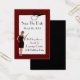 Pretty Art Deco style Save the Date birthday announcements, done in red, black, and white. Lovely digital artwork of a roaring 20's flapper decorates the bottom left of the card, with a dark red frame around the white text area and a black decorative scroll flourish at the top. Text in black and red is fully customisable to suit your needs.