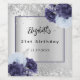 A faux silver looking background decorated with blue florals, flowers, and faux silver glitter, sparkles. Personalise and your name and a date.