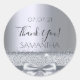Modern, stylish and glamourous for a girl's, woman's birthday party, bridal shower or baby shower. A faux silver looking background with an elegant faux silver bow, ribbon and sparkle. The text: Thank You! is written with a modern black hand lettered style script. Template for a name.