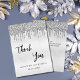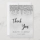 A thank you card for a 50th (or any age) birthday. A faux silver metallic looking background color. With faux glitter drips, paint dripping look. On front, a large hand lettered script and the text: Thank You, your text, title and a date.