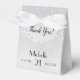 An elegant and glamourous 21st (or any age) birthday party. Faux silver looking background with faux diamonds. With the text: Thank You! Templates for a name, date of birth and date of anniversary and age number. Black letters.