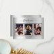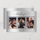 Add 3 of Your birthday photos, vertical size, a date, name, and the thank you note. A faux silver looking background with black text and frame. The text: Thank you on the front and your name on the back are written with a stylish hand lettered script with swashes.