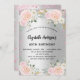 A modern, stylish and glamourous 40th (or any age) birthday party invitation. A faux silver looking background with pink faux glitter, sparkles, and blush pink florals. The name is written with a modern hand lettered style script. Personalise and add your details.