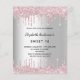 A modern, stylish and glamourous invitation for a Sweet 16, 16th (or any age) birthday party. A faux silver looking background with an elegant pink faux glitter drip, paint dripping look. The name is written with a black modern hand lettered style script. Personalise and add a name, age and party details.