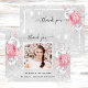 A simple and elegant sympathy thank you card with photo. A faux silver metallic looking background, a white frame, faux glitter dust, pink roses, florals. Personalise and add your thank you note. Black text.