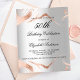 A faux silver looking background. Decorated with rose gold mable veins. Personalise and add a name, age and party details. The name is written with a hand lettered style script.